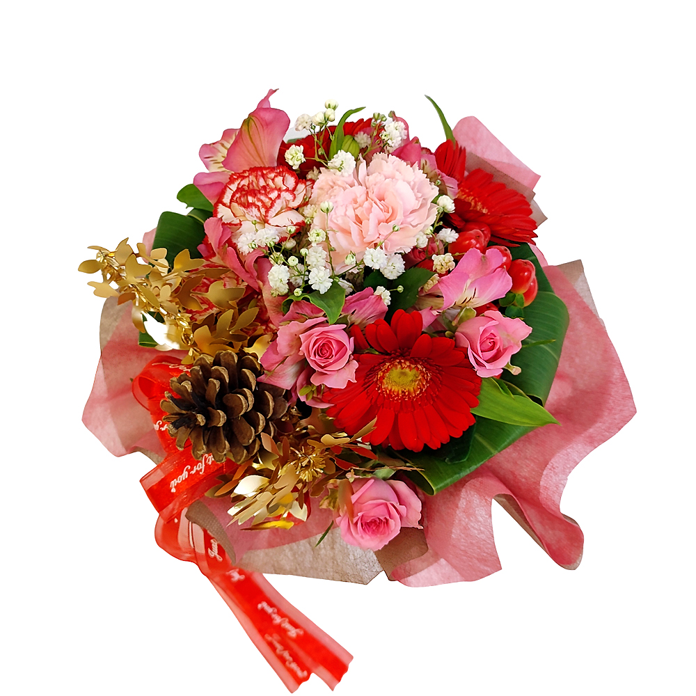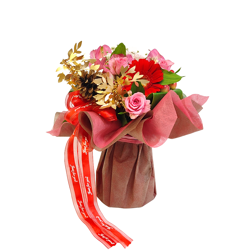 12月の限定花束です。お誕生日やご退職祝いなどにも。自立するのでそのまま飾れます。