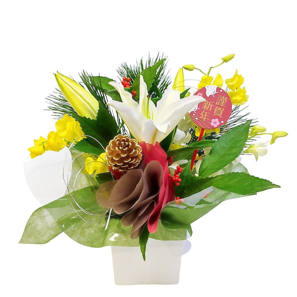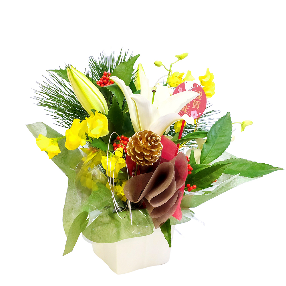 ユリ、スイートピー、デンファレ、松、千両 (生産や在庫の関係で一部花材や資材が変わることがあります)