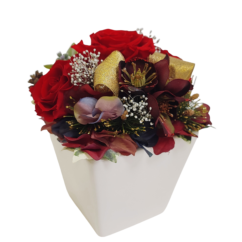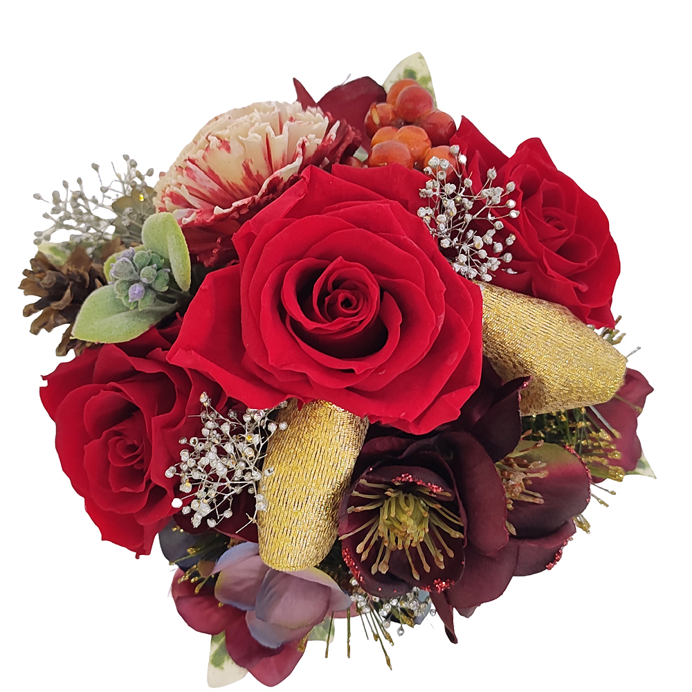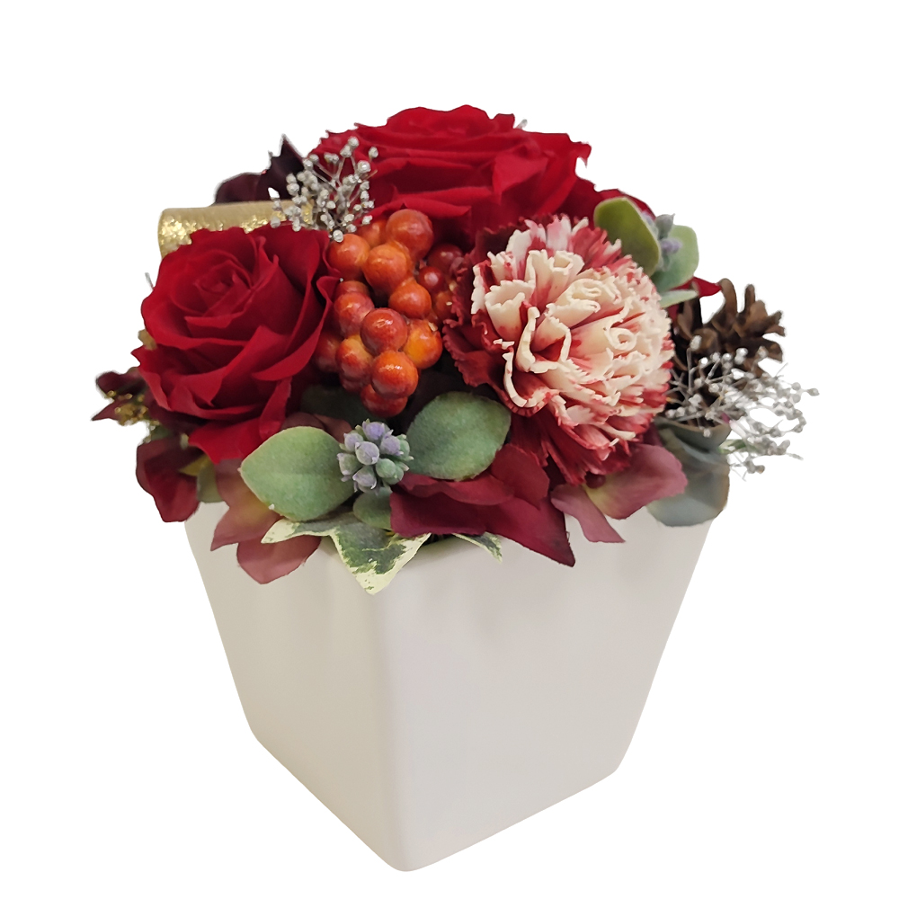 ソーラーローズ、、アイベリーピック、アートクリスマスローズ、マツカサ、リボン等 クリアケース付 (資材は変わることかございます