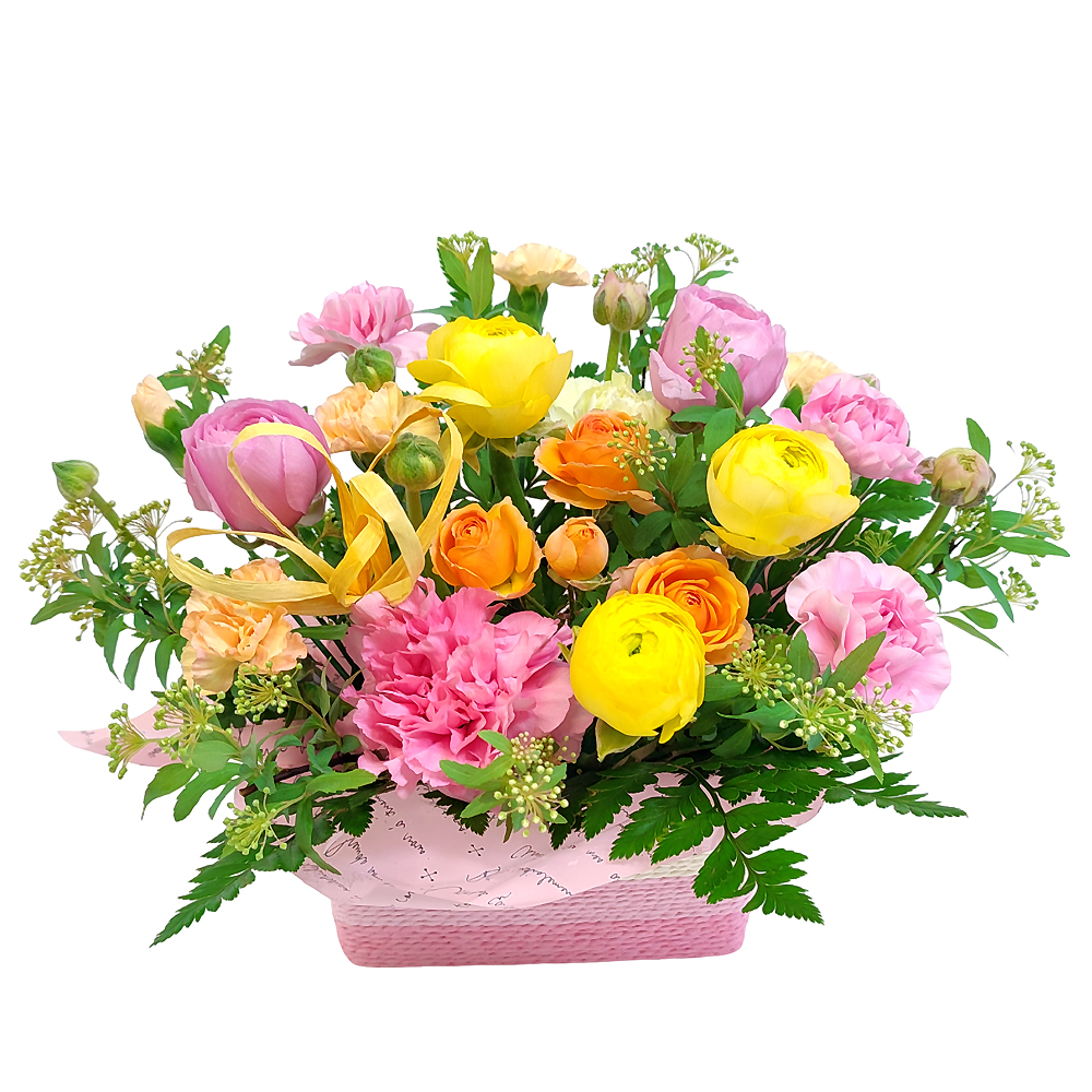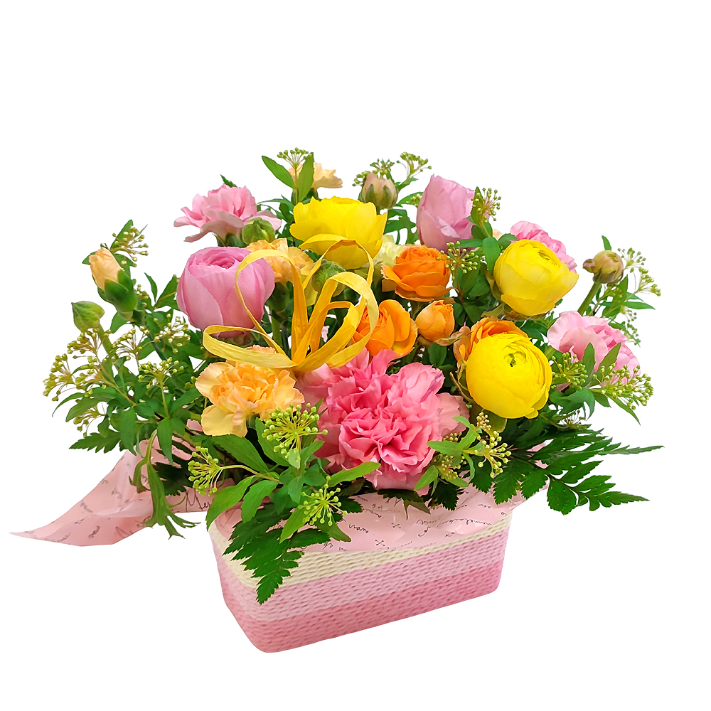 ラナンキュラスをメインにカラフルで可愛らしいアレンジに仕上げました。3月限定のアレンジメントです。