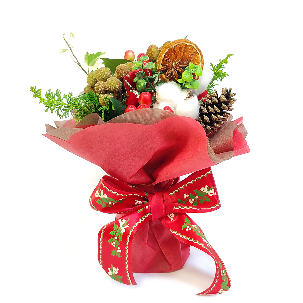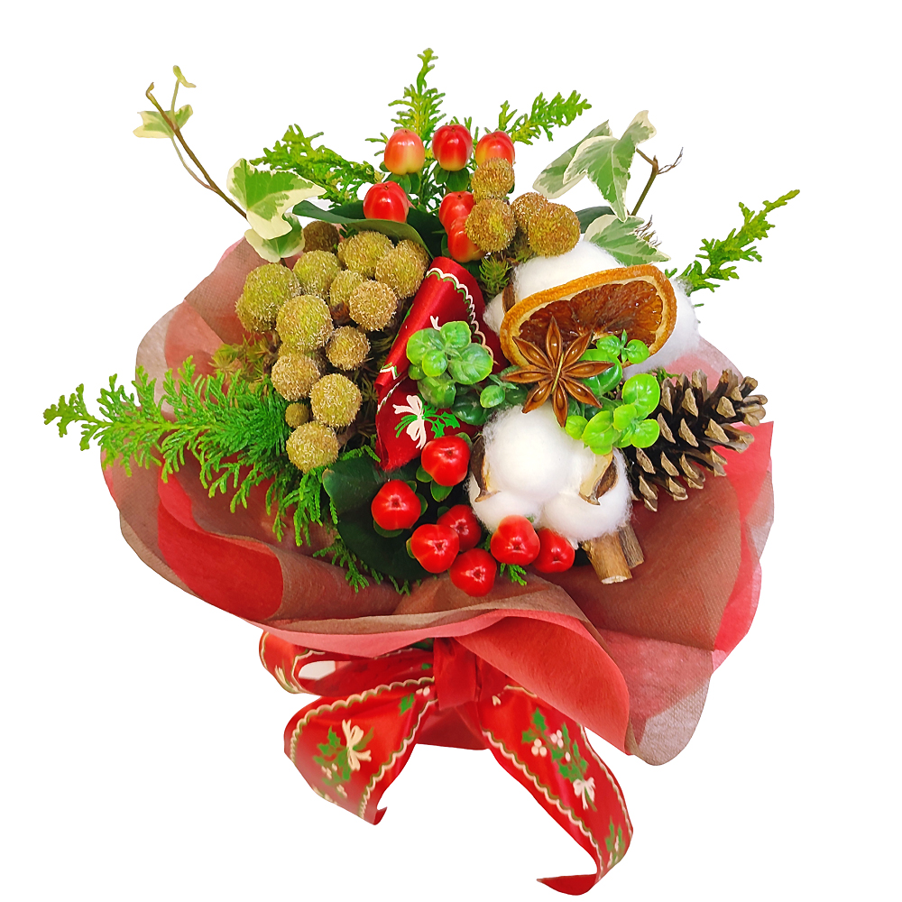 クリスマス期間限定商品です。実物やグリーンなどを使用してクリスマス期間に飾れる花束にいたします。リーズナブルな自立するミニブーケ♪